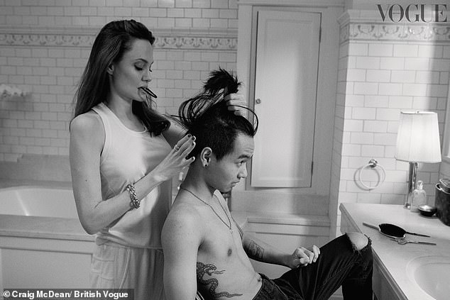 Jolie styles the hair of her oldest son Maddox, 19 | British Vogue