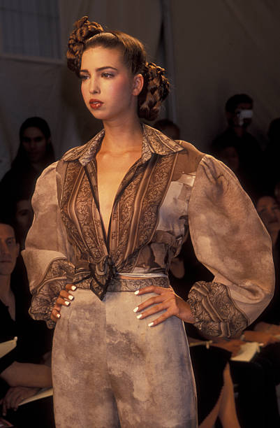 Rocking curly hair, Ivanka models the Vivienne Westwood 1999 Fall/Winter collection at Bryant Park in New York City.