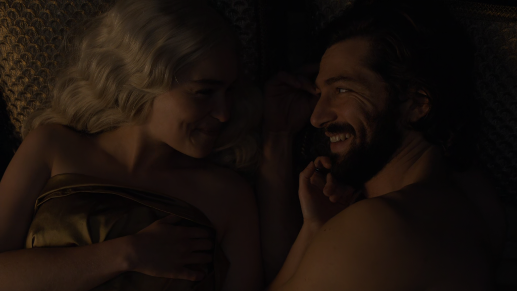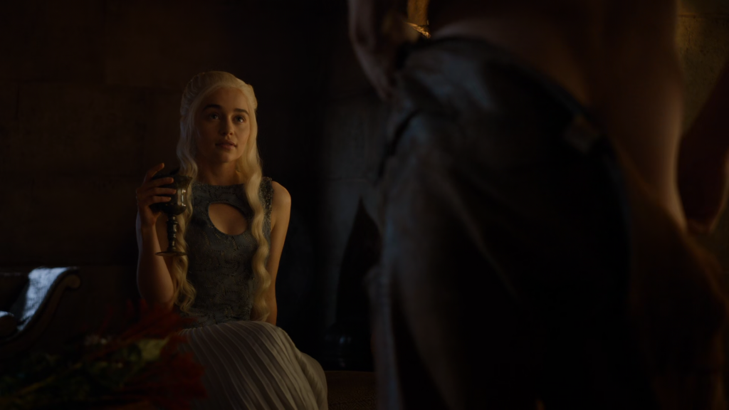 In this scene, Daenerys and Daario discuss some heavy matters. She is supposed to marry Hizdahr zo Loraq to secure her position as the Queen of Mereen. Meanwhile, Daario suggests that she marry him and points out that if she can’t marry who she wants to, she is the only one in the city that isn’t free.