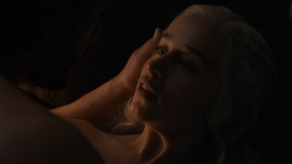 To help solve this issue, Dany consults with a handmaiden called Doreah who shows her the finer points of taking control in bed. While these two don’t actually have sex, the chemistry and connection between Daenerys and Doreah are palpable. And in the very same episode, we get to see Dany put these sexual lessons to use with Khal Drago right away.