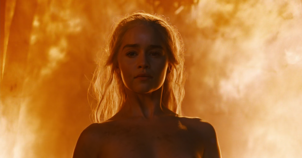 Well, almost everyone. Daenerys counted on the fact that she is fireproof (a side effect of her Targaeryn heritage). And bringing the show full circle, she once again emerges naked and strong from the fire. Only now, she has an entire army bowing down to her.