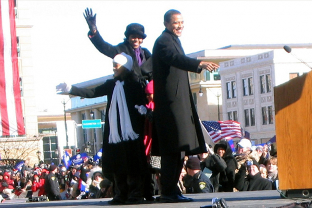 Symbolically, Barack Obama made this announcement from the Old State Capitol in Springfield, Illinois where Lincoln’s own political career began. And in typical fashion he brought his family, including Malia. At only eight years old, Malia wore a black coat, white scarf, and cute beanie.